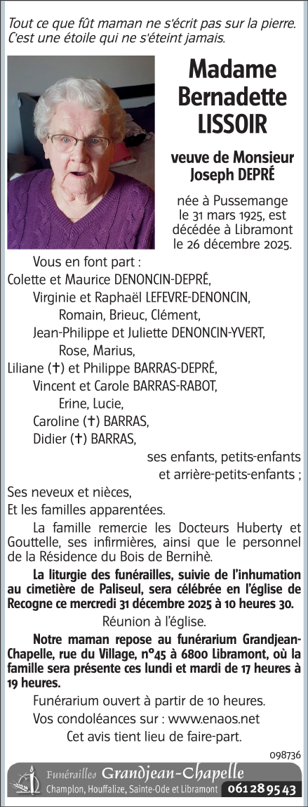 Died in Libramont (6800, Belgium) on 26 December 2025 at the age of 100 years