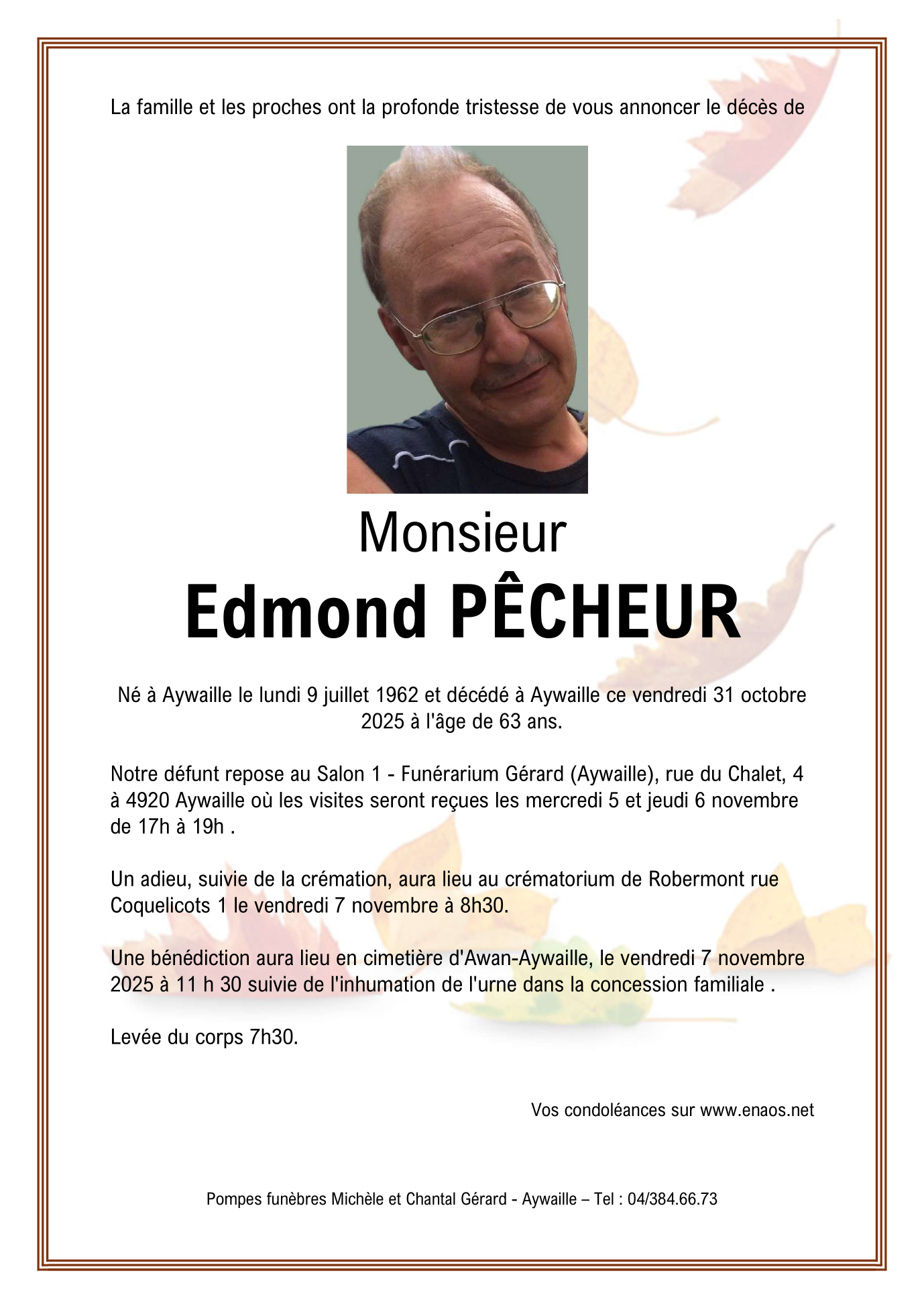 Décédé à Aywaille (4920, Belgique) le vendredi 31 octobre 2025 à l'âge de 63 ans