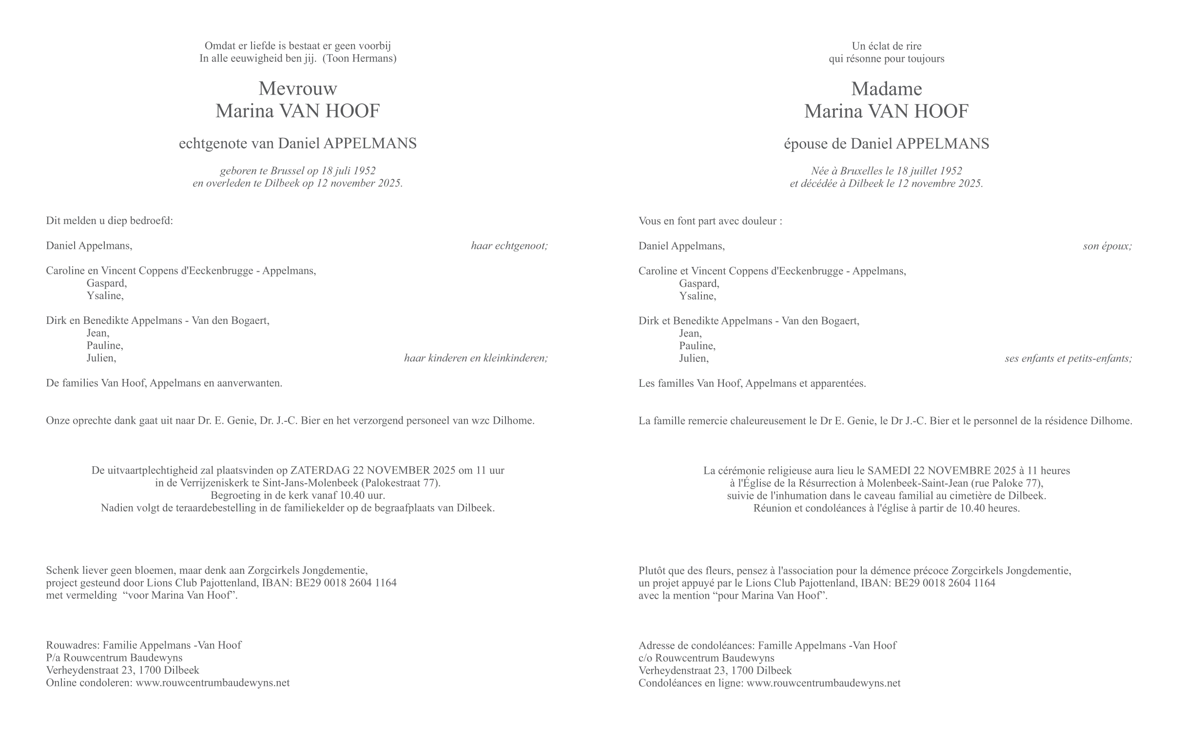 Décédée à Dilbeek (1700, Belgique) le mercredi 12 novembre 2025 à l'âge de 73 ans