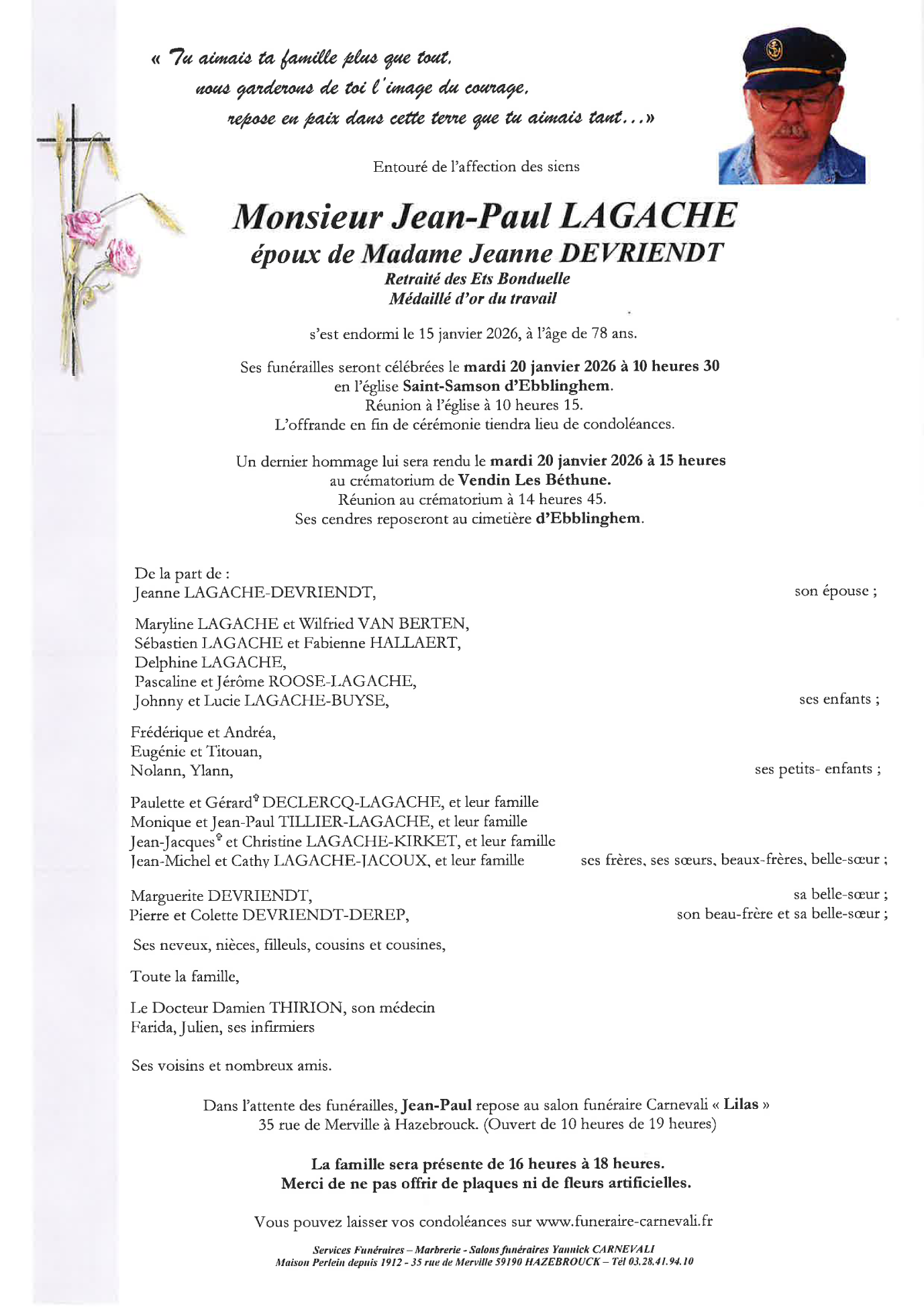Died in Lomme (59160, France) on 15 January 2026 at the age of 78 years