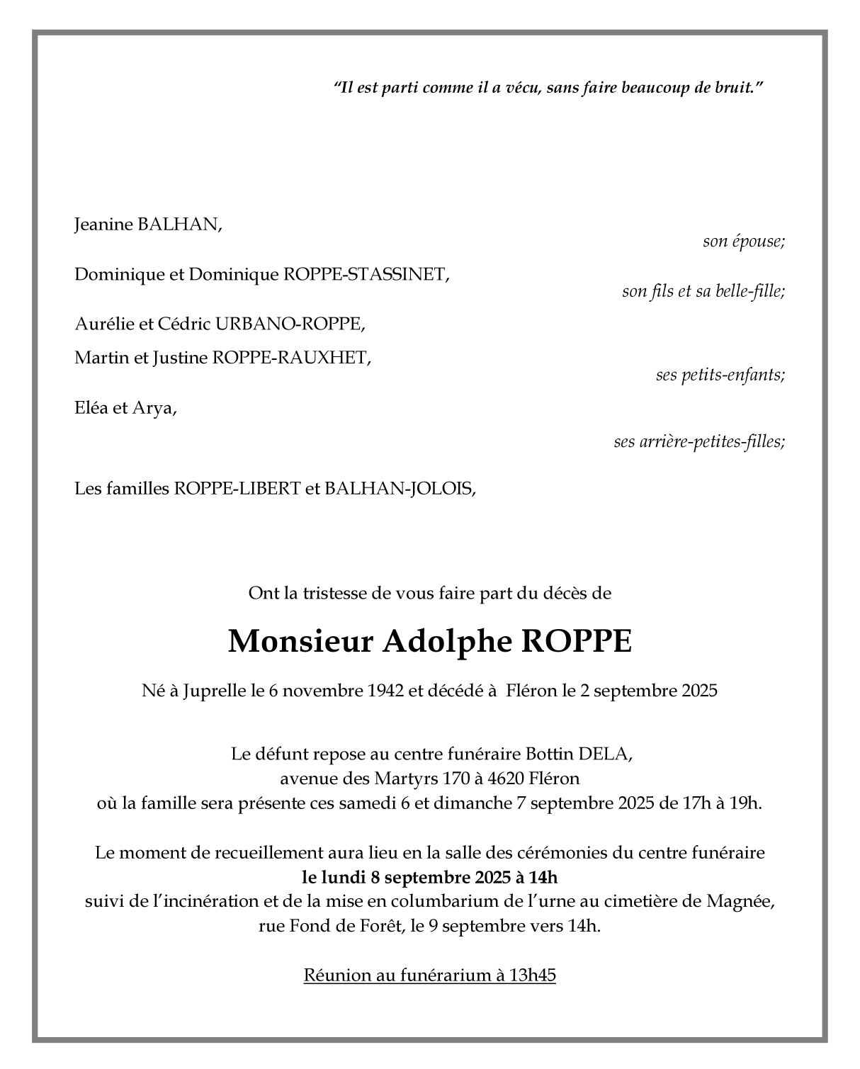 Décédé à Fléron (4620, Belgique) le mardi 2 septembre 2025 à l'âge de 82 ans