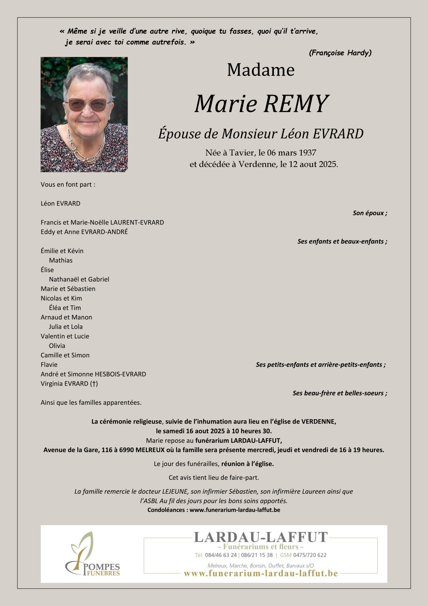Died in Verdenne (6900, Belgium) on 12 August 2025 at the age of 88 years