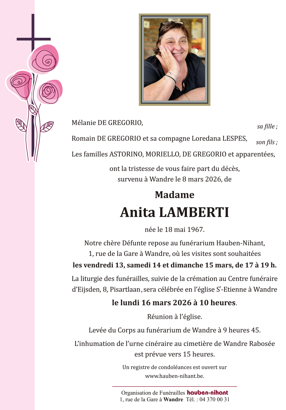 Décédée à Wandre (4020, Belgique) le dimanche 8 mars 2026 à l'âge de 58 ans