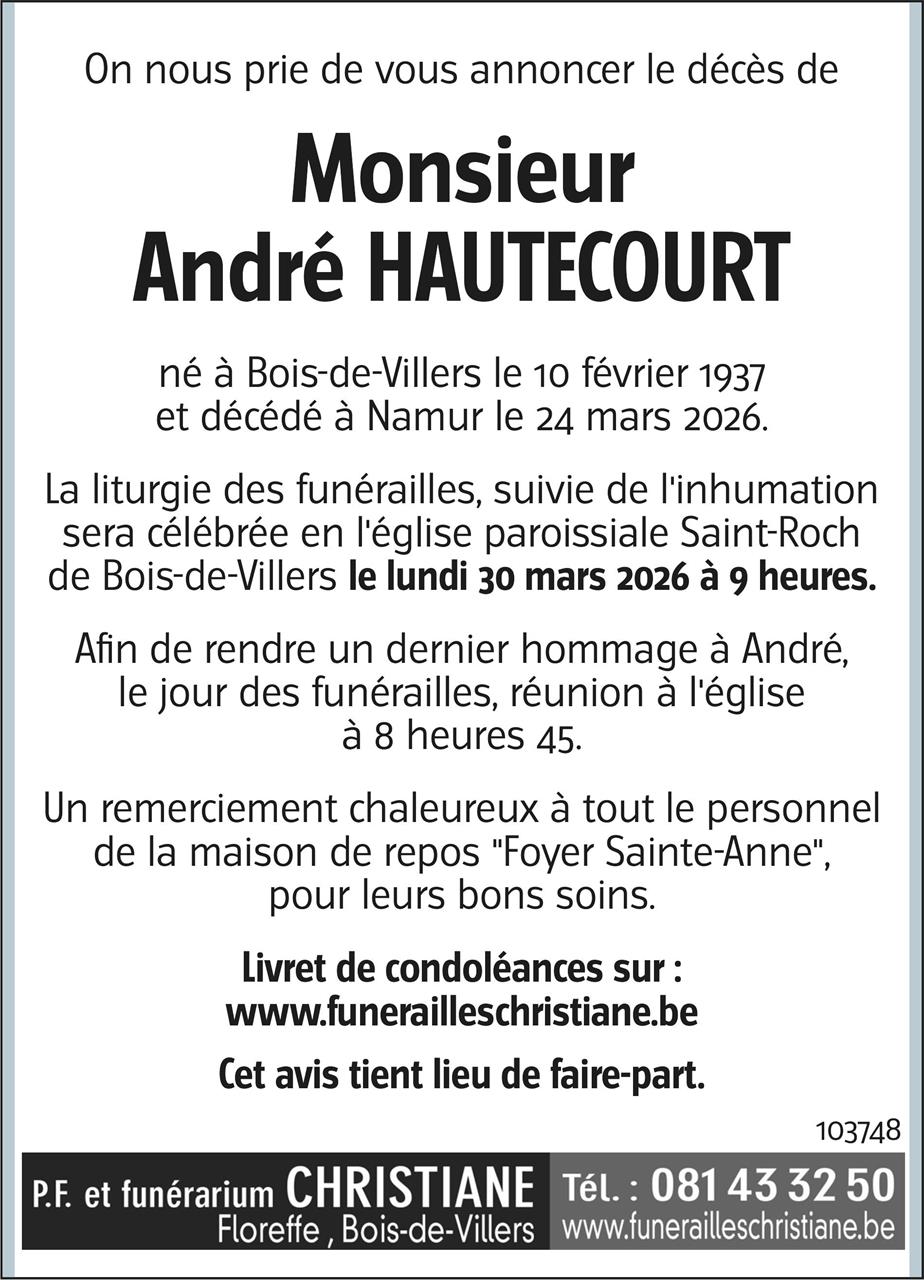 Died in Namur (5000, Belgium) on 24 March 2026 at the age of 89 years