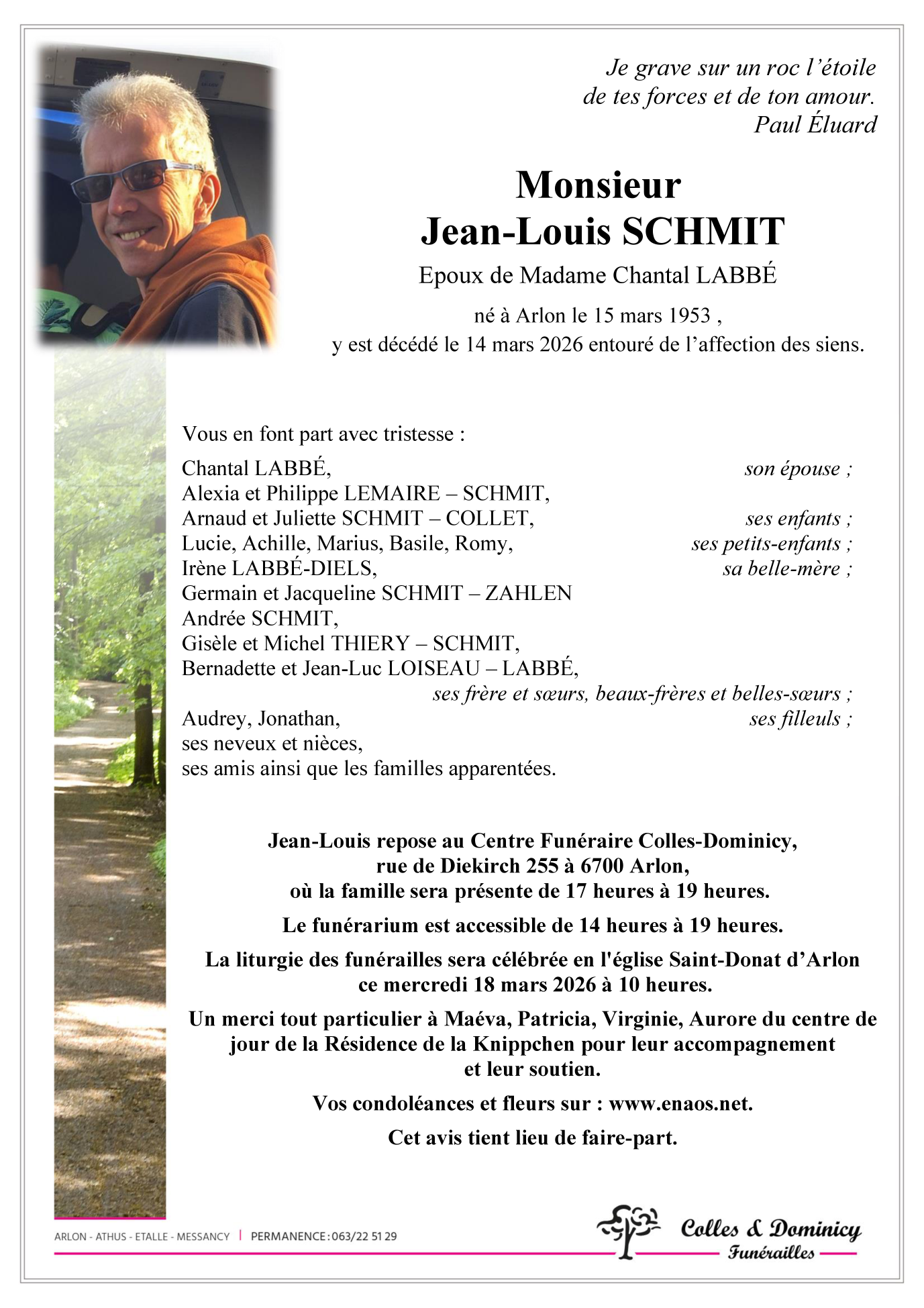 Décédé à Arlon (6700, Belgique) le samedi 14 mars 2026 à l'âge de 72 ans