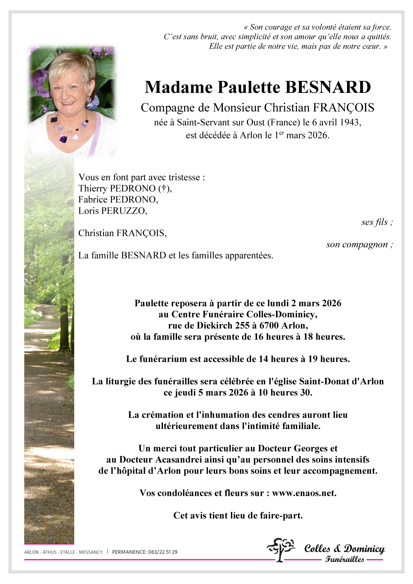 Died in Arlon (6700, Belgium) on 01 March 2026 at the age of 82 years