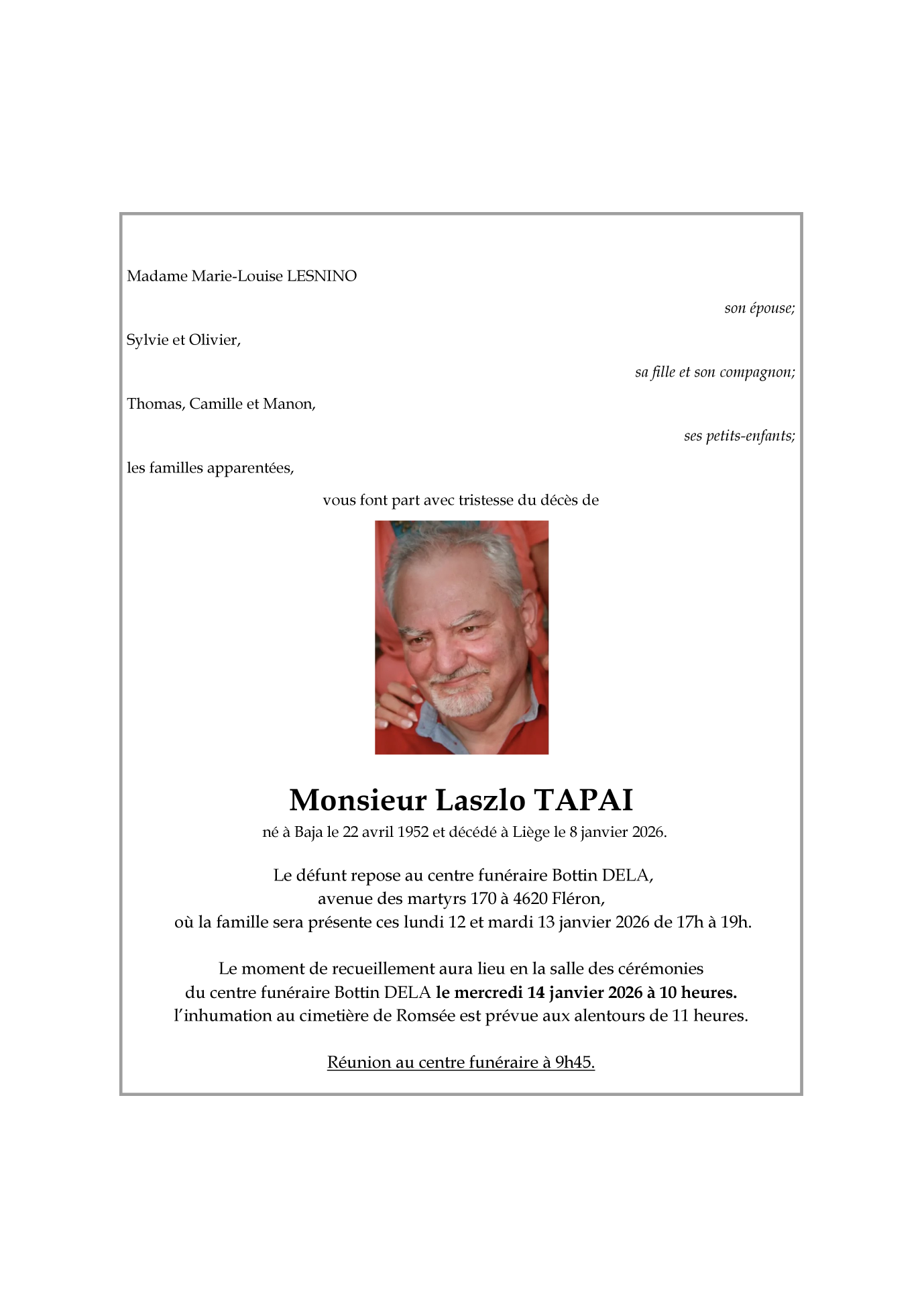 Décédé à Liège (4000, Belgique) le jeudi 8 janvier 2026 à l'âge de 73 ans