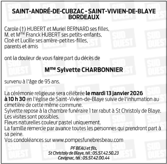 Décédée à Bordeaux (33000, France) le samedi 3 janvier 2026 à l'âge de 95 ans