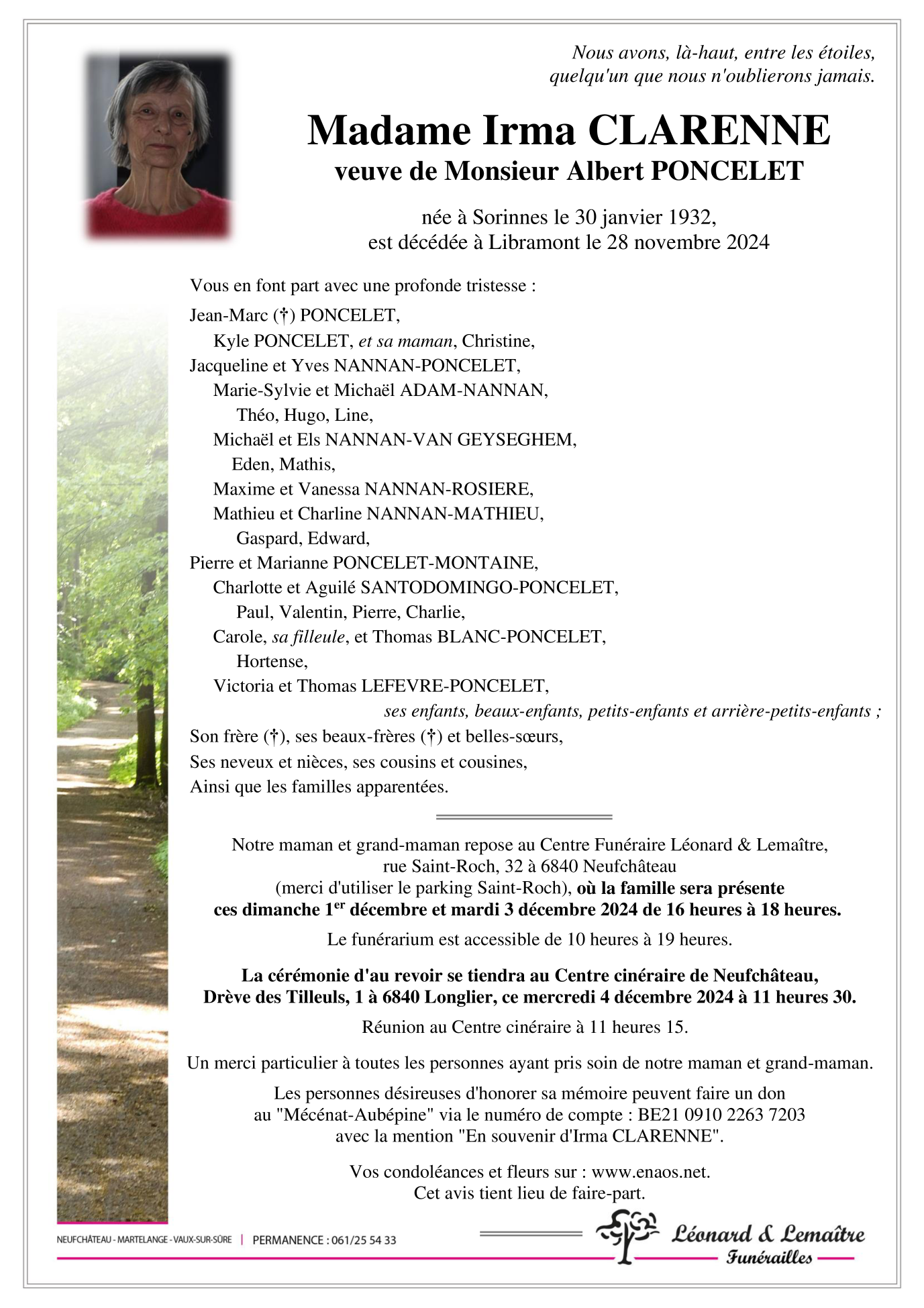 Fallecida en Libramont-Chevigny (6800, Bélgica) el jueves, 28 de noviembre de 2024 a la edad de 92 años