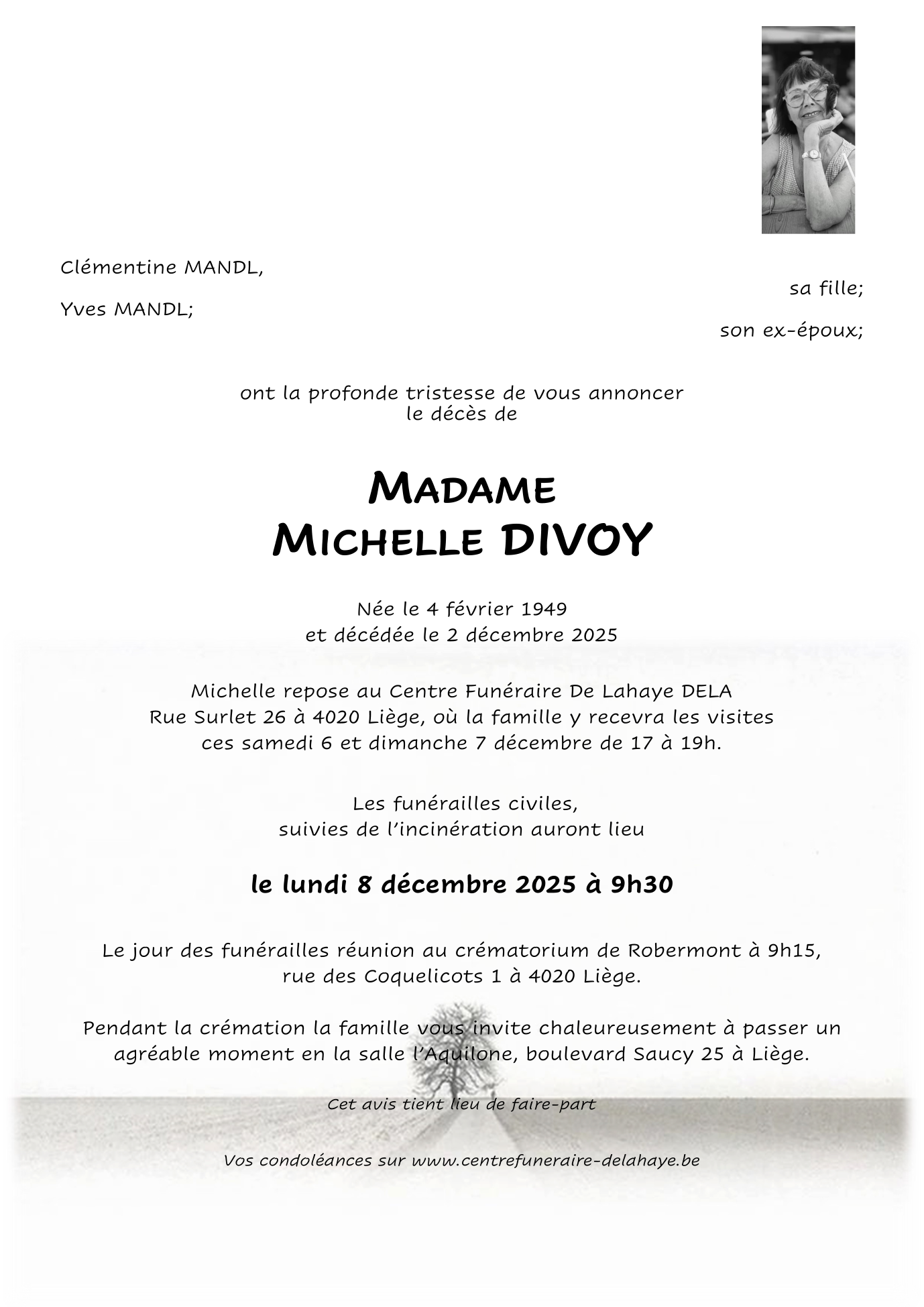 Décédée à Liège (4000, Belgique) le mardi 2 décembre 2025 à l'âge de 76 ans