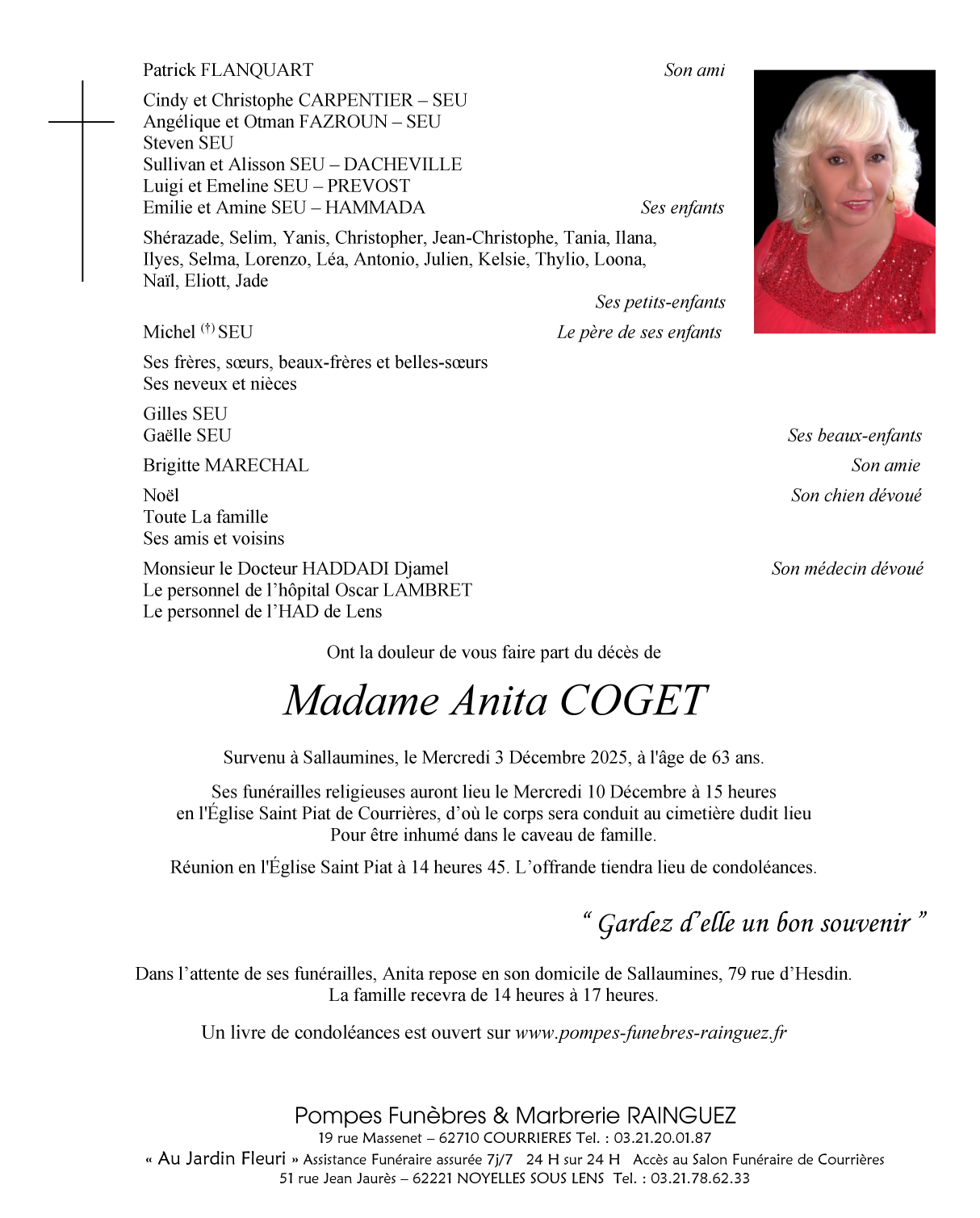 Décédée à Sallaumines (62430, France) le mercredi 3 décembre 2025 à l'âge de 63 ans