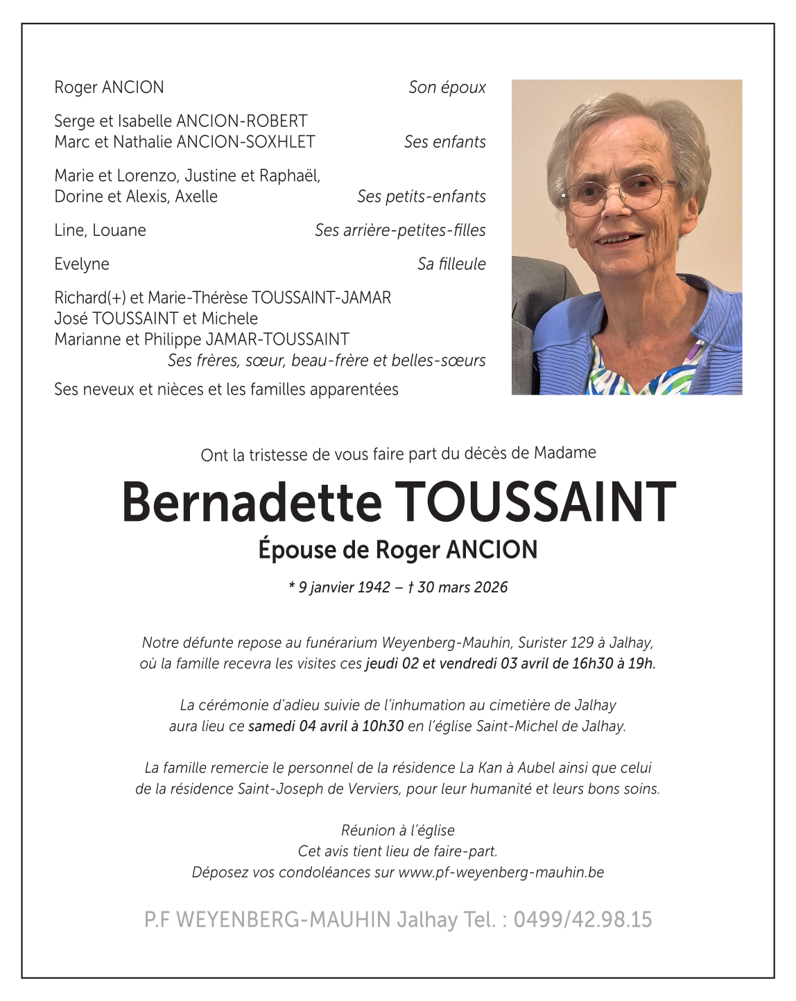 Overleden te Verviers (4800, België) op maandag 30 maart 2026 op 84-jarige leeftijd