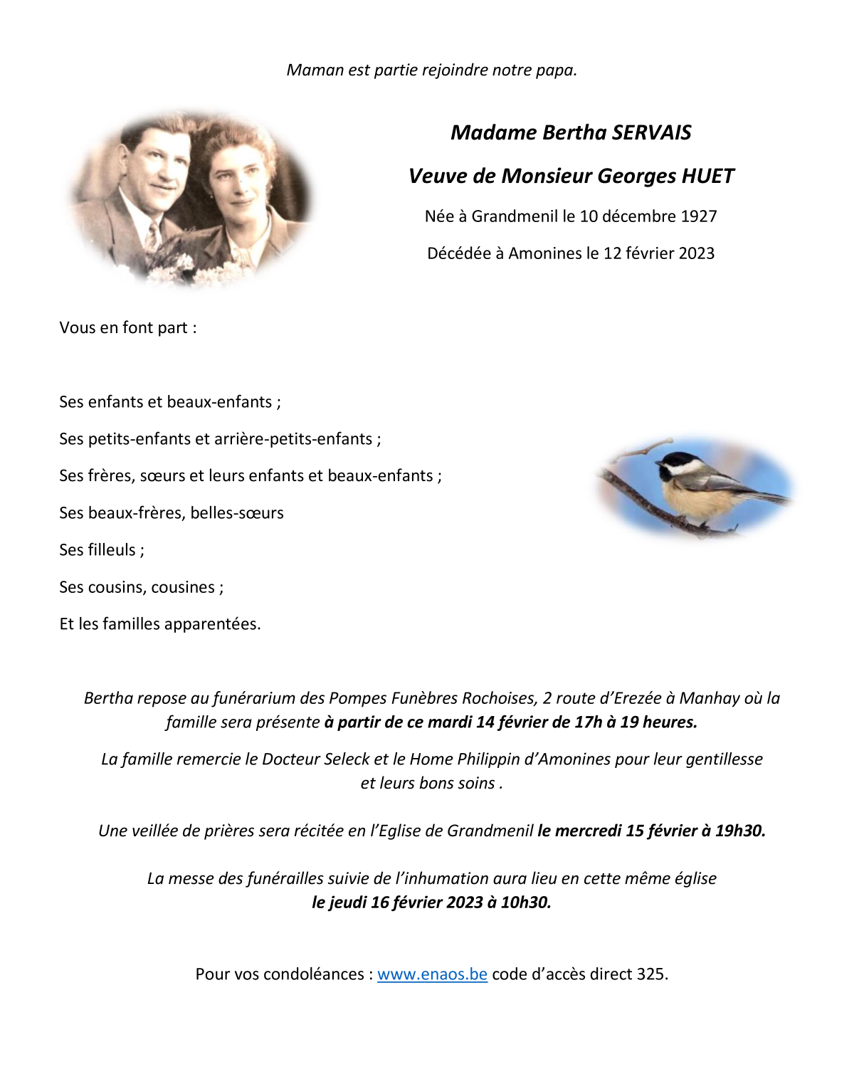 Décédée à Erezée (6997, Belgique) le dimanche 12 février 2023 à l'âge de 95 ans