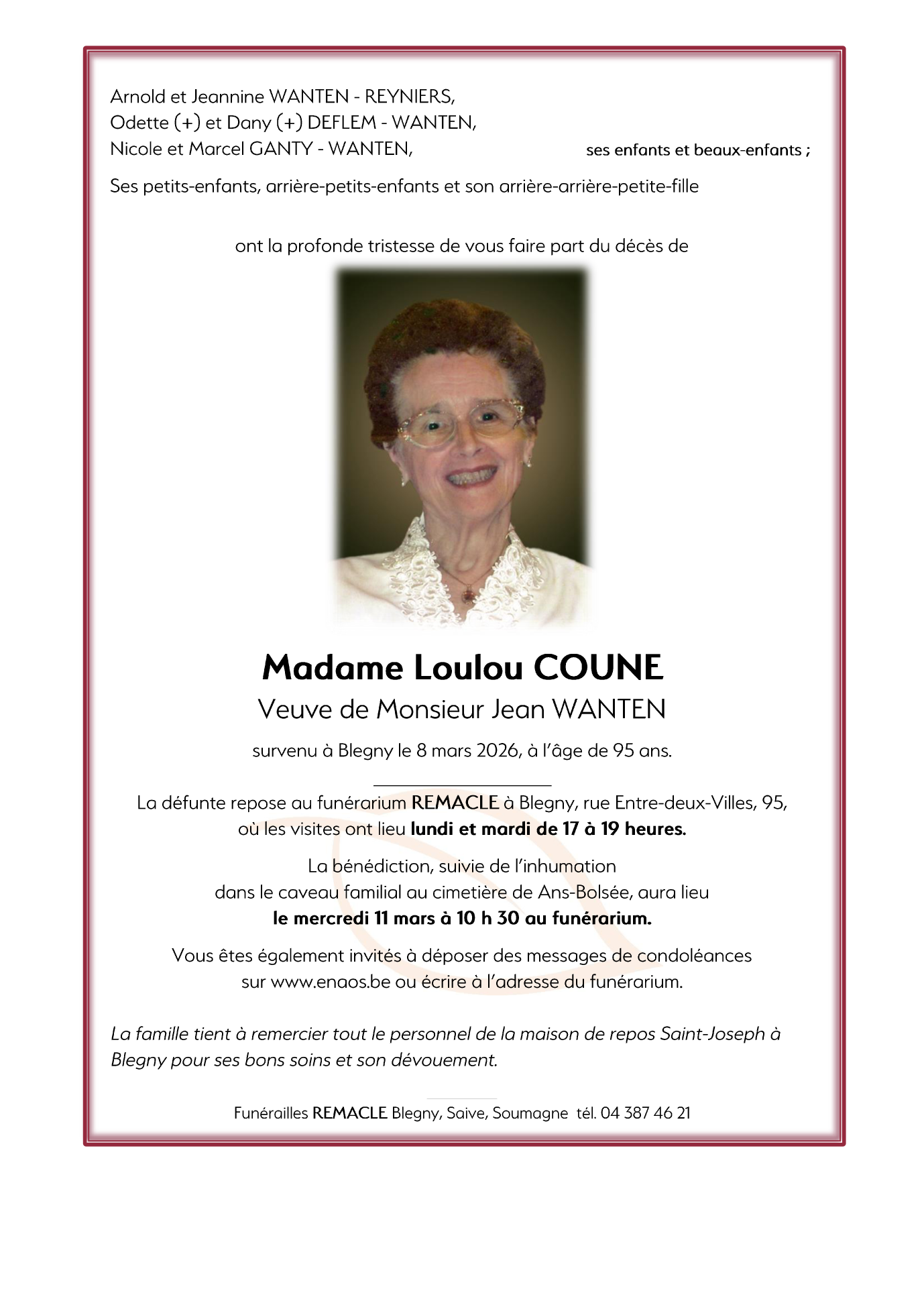 Décédée à Blegny (4670, Belgique) le dimanche 8 mars 2026 à l'âge de 95 ans