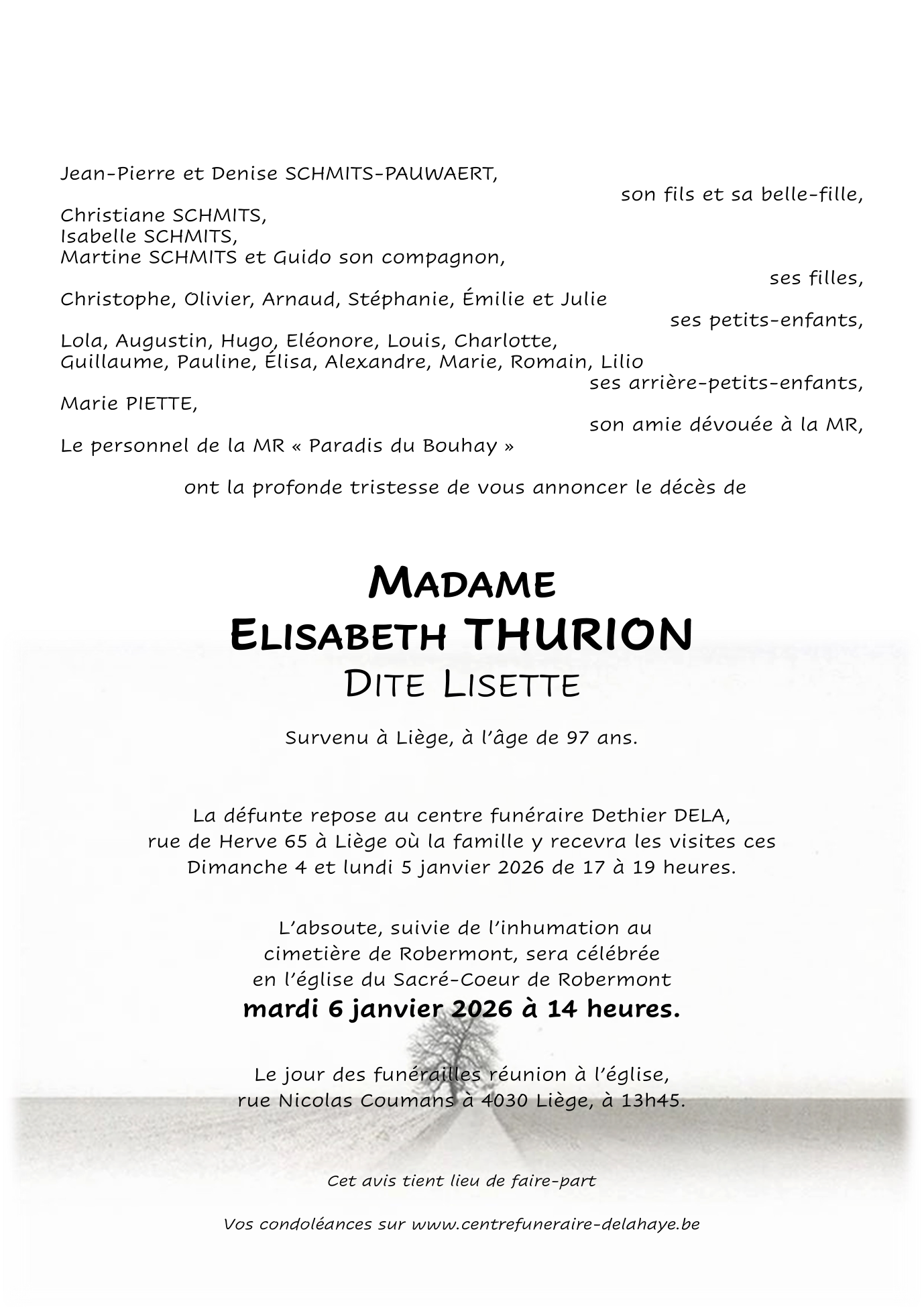 Overleden te Liège (4020, België) op zondag 21 december 2025 op 97-jarige leeftijd