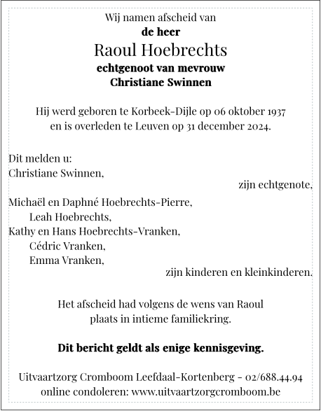 Overleden te Leuven (3000, België) op dinsdag 31 december 2024 op 87-jarige leeftijd
