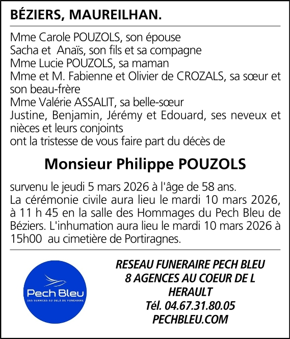 Décédé à Boujan-sur-Libron (34760, France) le jeudi 5 mars 2026 à l'âge de 58 ans