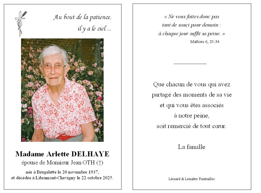 Fallecida en Libramont-Chevigny (6800, Bélgica) el miércoles, 22 de octubre de 2025 a la edad de 87 años