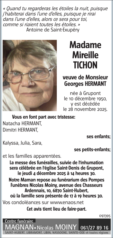 Décédée à Grupont (6927, Belgique) le dimanche 30 novembre 2025 à l'âge de 74 ans