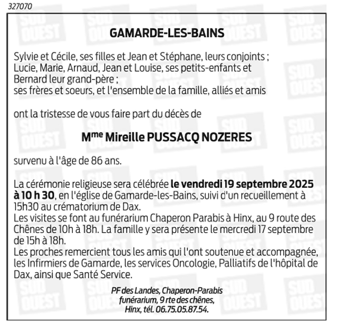 Fallecida en Gamarde-les-Bains (40380, Francia) el viernes, 12 de septiembre de 2025 a la edad de 86 años
