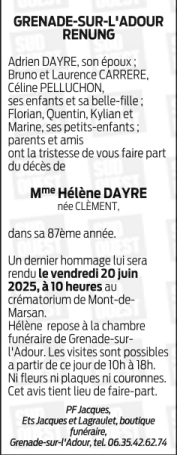 Décédée à Aire-sur-l'Adour (40800, France) le lundi 16 juin 2025 à l'âge de 86 ans