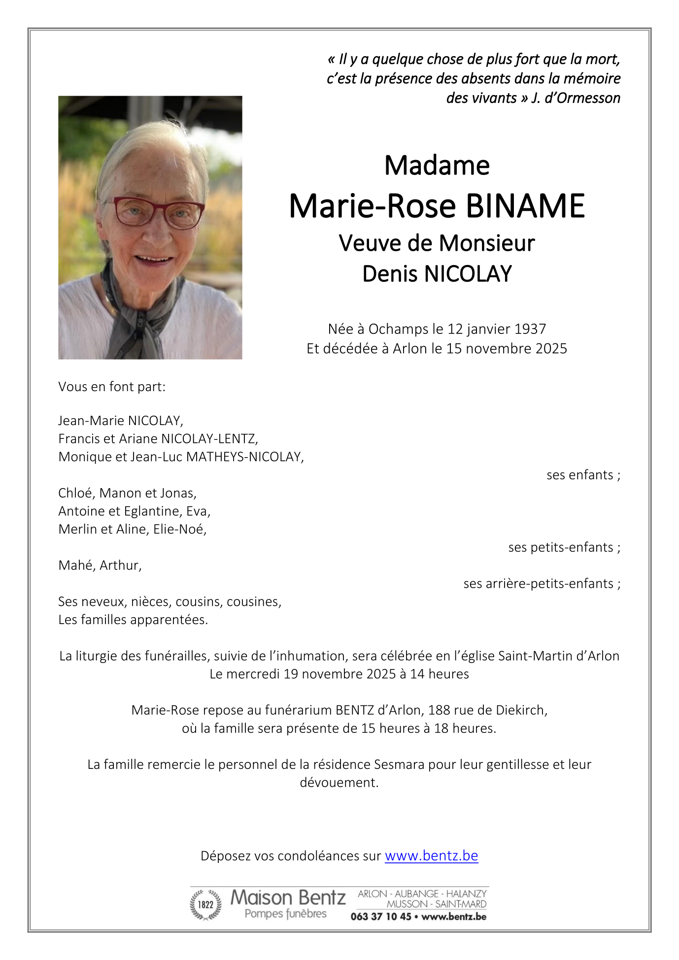 Décédée à Arlon (6700, Belgique) le samedi 15 novembre 2025 à l'âge de 88 ans