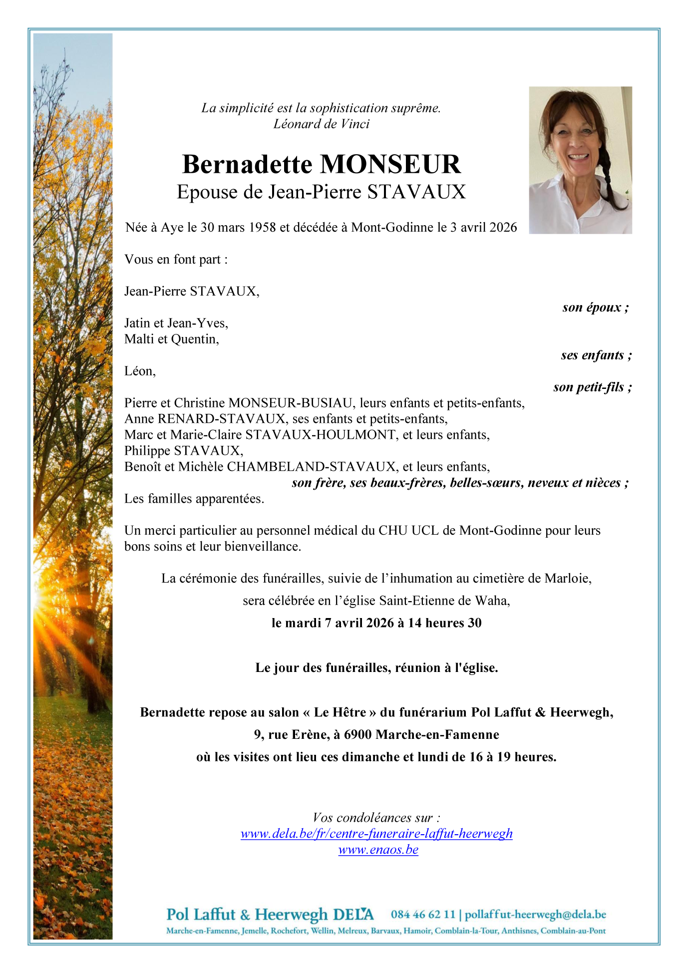 Décédée à Yvoir (5530, Belgique) le vendredi 3 avril 2026 à l'âge de 68 ans