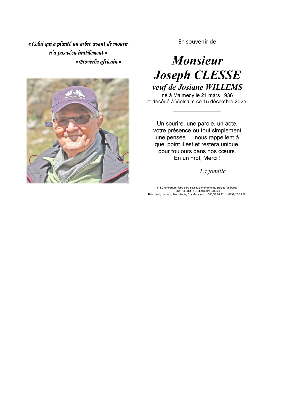Décédé à Vielsalm (6690, Belgique) le lundi 15 décembre 2025 à l'âge de 89 ans