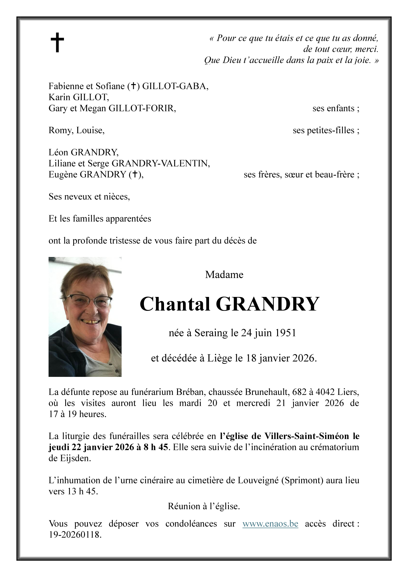 Décédée à Liège (4000, Belgique) le dimanche 18 janvier 2026 à l'âge de 74 ans