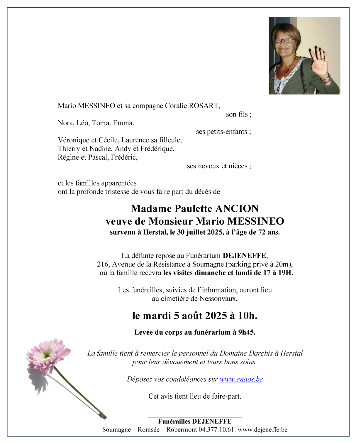 Décédée à Herstal (4040, Belgique) le mercredi 30 juillet 2025 à l'âge de 72 ans