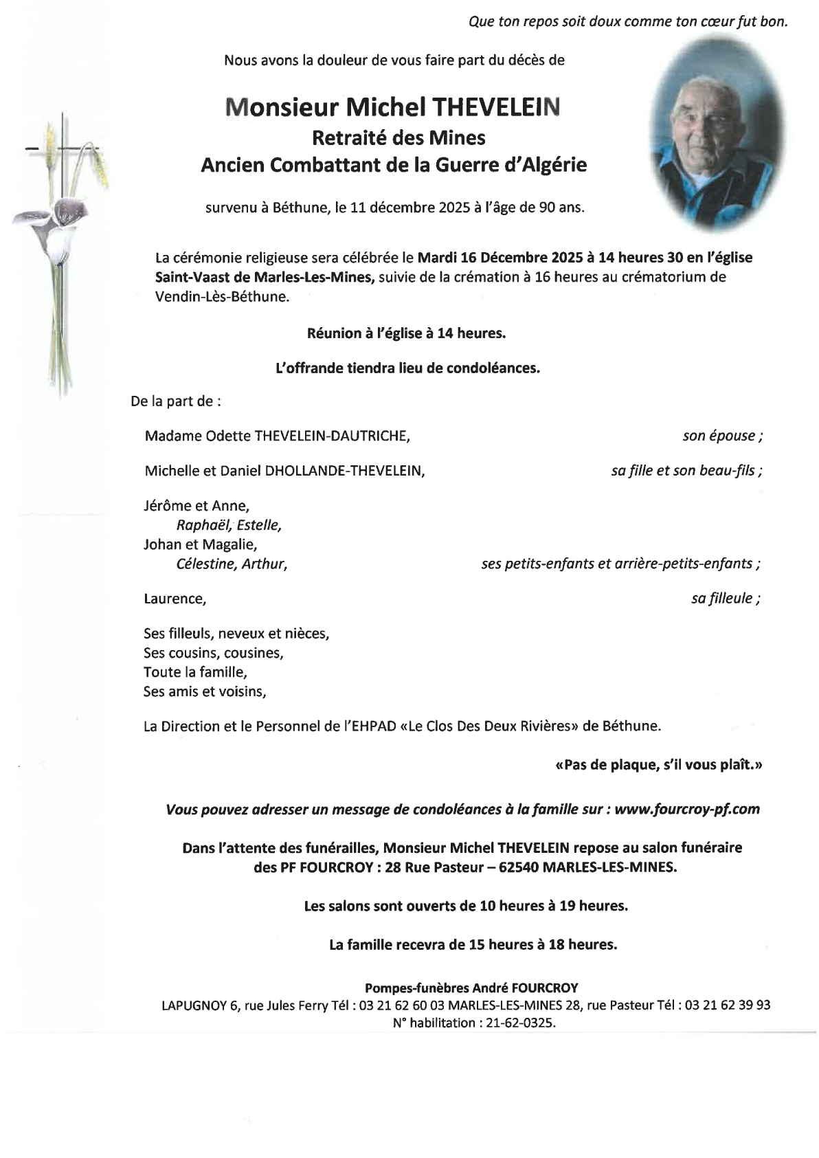 Décédé à Béthune (62400, France) le jeudi 11 décembre 2025 à l'âge de 90 ans