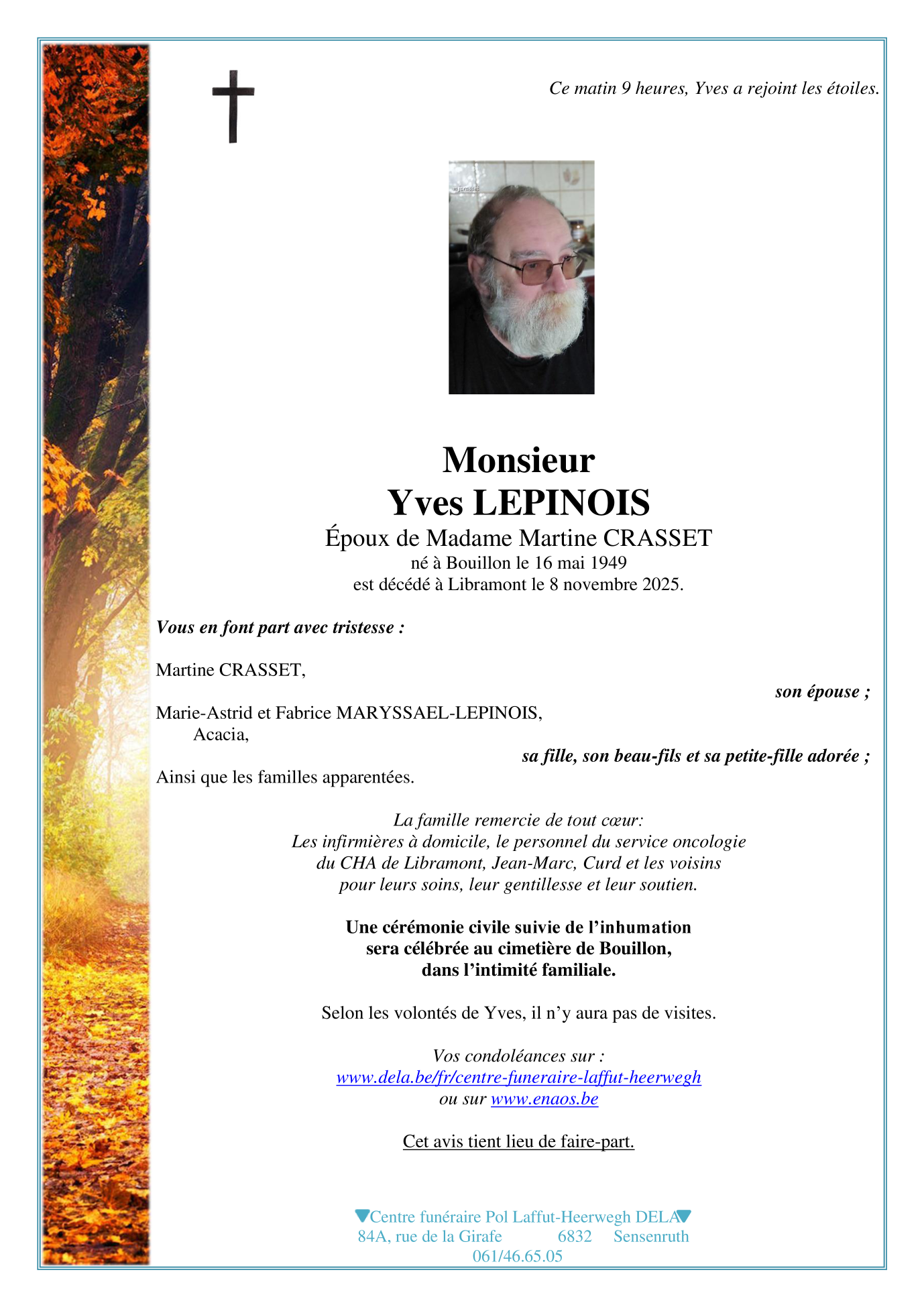 Décédé à Libramont-Chevigny (6800, Belgique) le samedi 8 novembre 2025 à l'âge de 76 ans