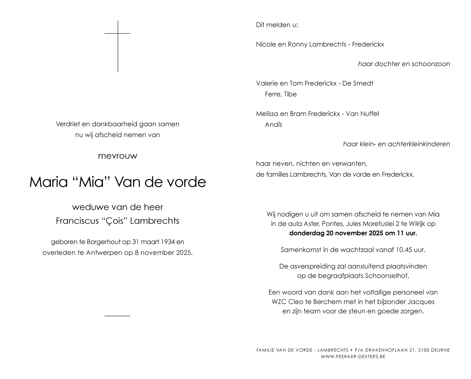 Overleden te Antwerpen (2020, België) op zaterdag 8 november 2025 op 91-jarige leeftijd