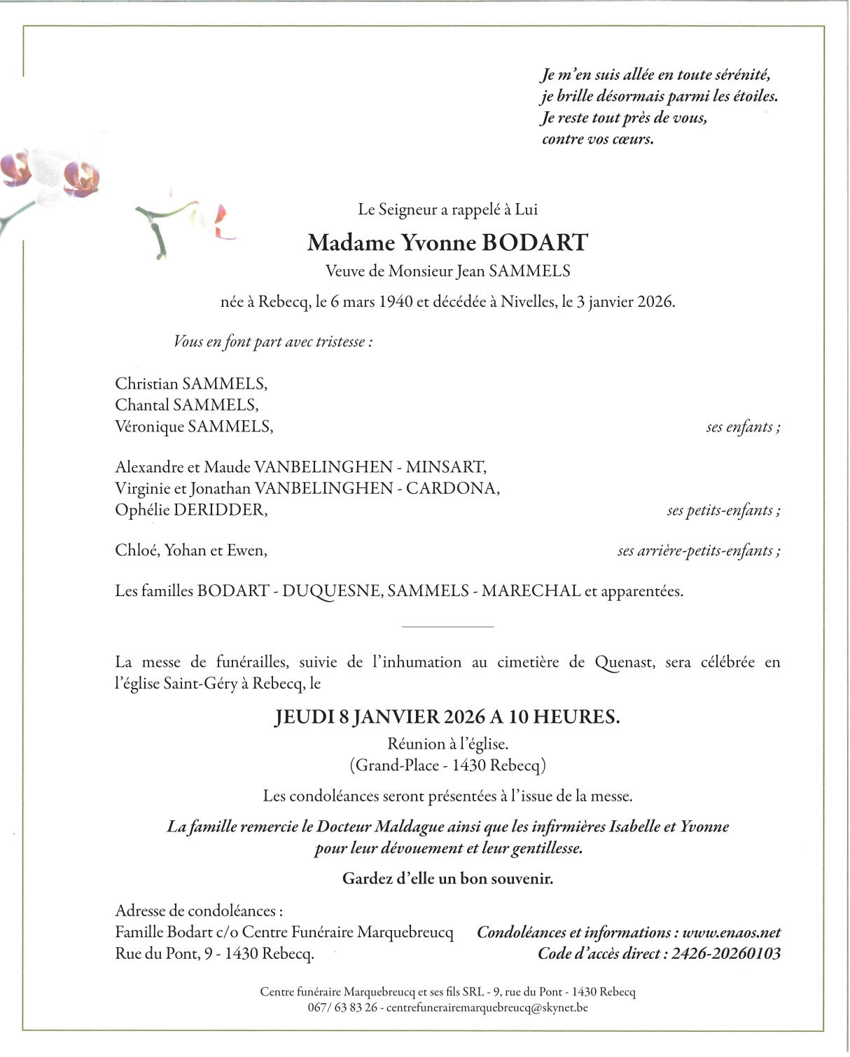 Décédée à Nivelles (1400, Belgique) le samedi 3 janvier 2026 à l'âge de 85 ans