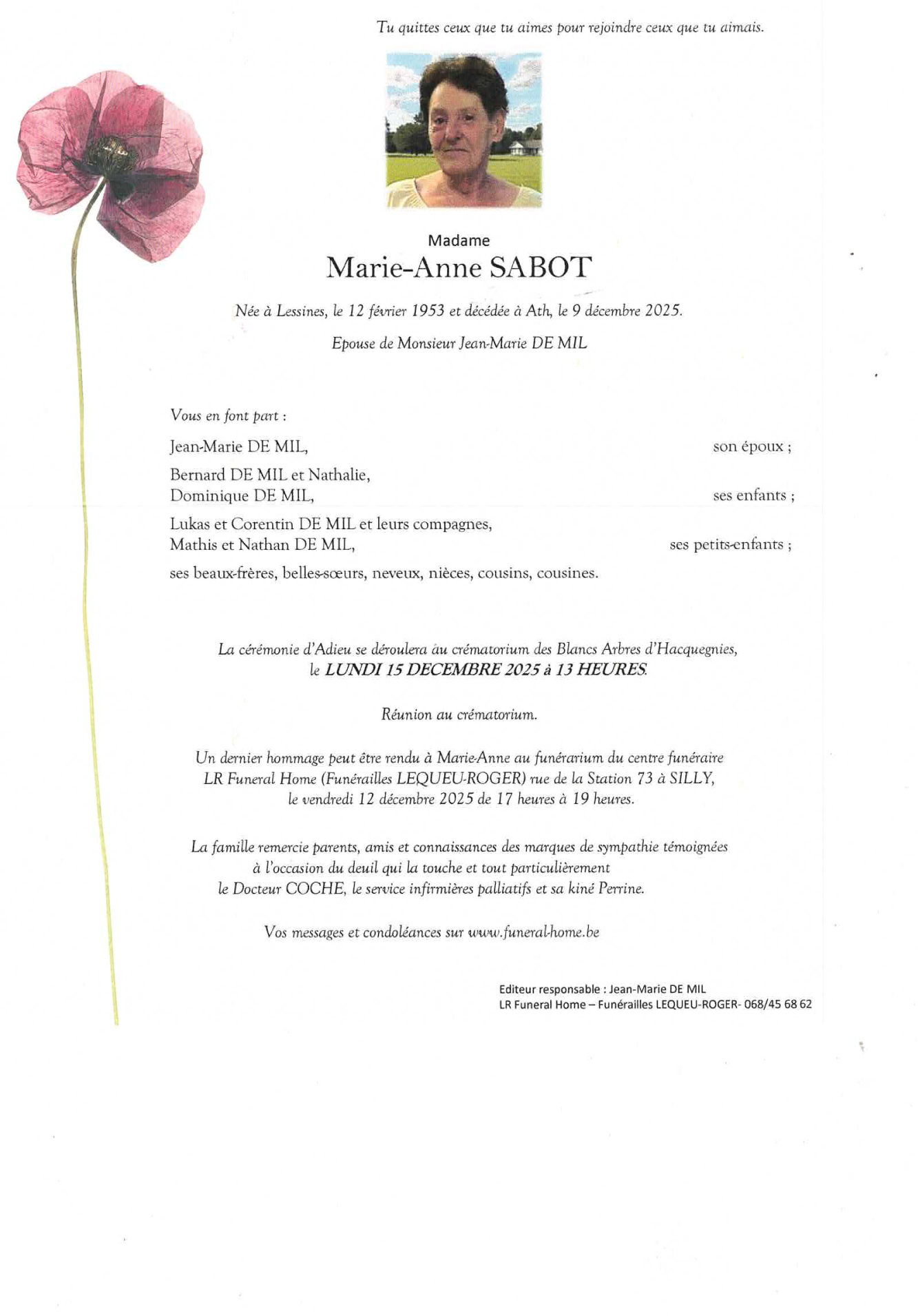 Fallecida en Ath (7800, Bélgica) el martes, 9 de diciembre de 2025 a la edad de 72 años
