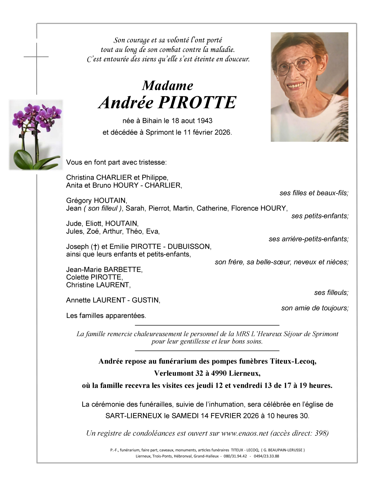 Décédée à Sprimont (4140, Belgique) le mercredi 11 février 2026 à l'âge de 82 ans