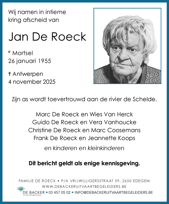 Overleden te Antwerpen (2020, België) op dinsdag 4 november 2025 op 70-jarige leeftijd