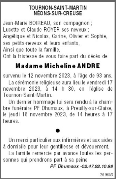Overleden te Le Blanc (36300, Frankrijk) op zondag 12 november 2023 op 93-jarige leeftijd