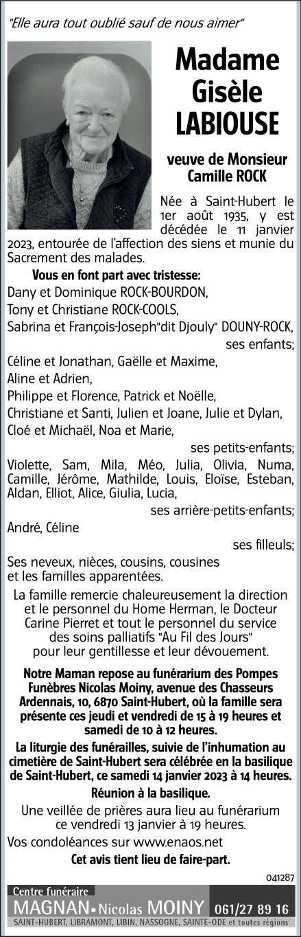 Décédée à Saint-Hubert (6870, Belgique) le mercredi 11 janvier 2023 à l'âge de 87 ans