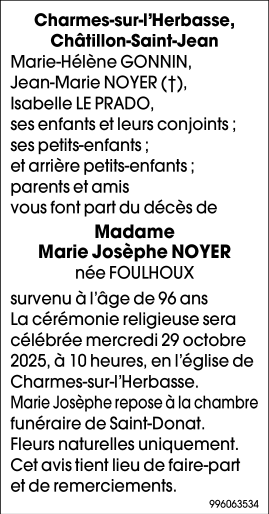 Décédée à Châteauneuf-de-Galaure (26330, France) le samedi 25 octobre 2025 à l'âge de 96 ans