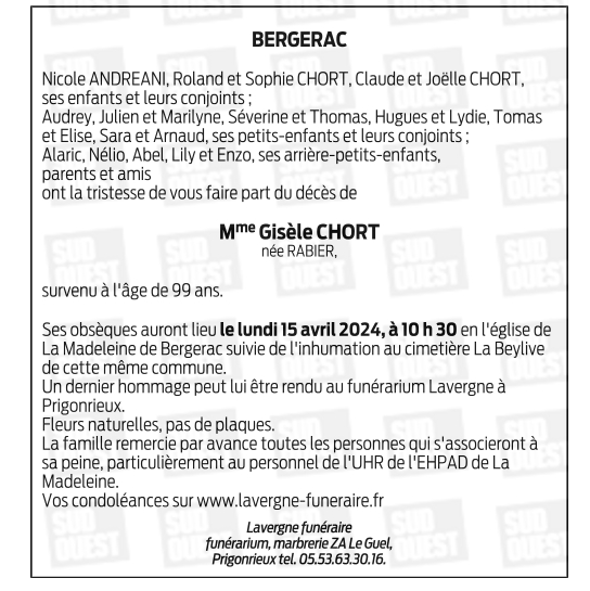 Died in Bergerac (24100, France) on 11 April 2024 at the age of 99 years