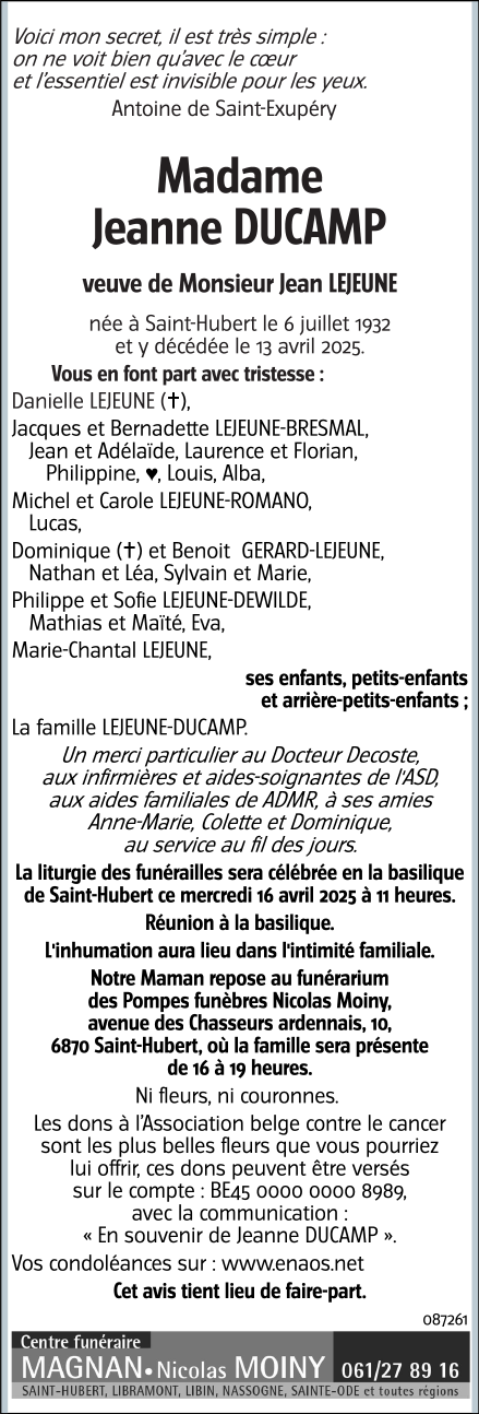 Décédée à Saint-Hubert (6870, Belgique) le dimanche 13 avril 2025 à l'âge de 92 ans