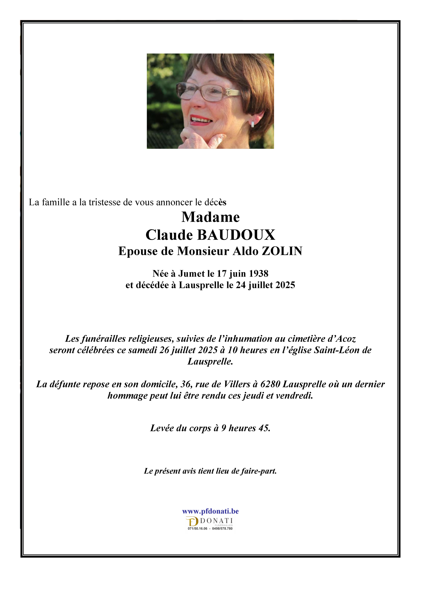 Fallecida en Lausprelle (6280, Bélgica) el jueves, 24 de julio de 2025 a la edad de 87 años