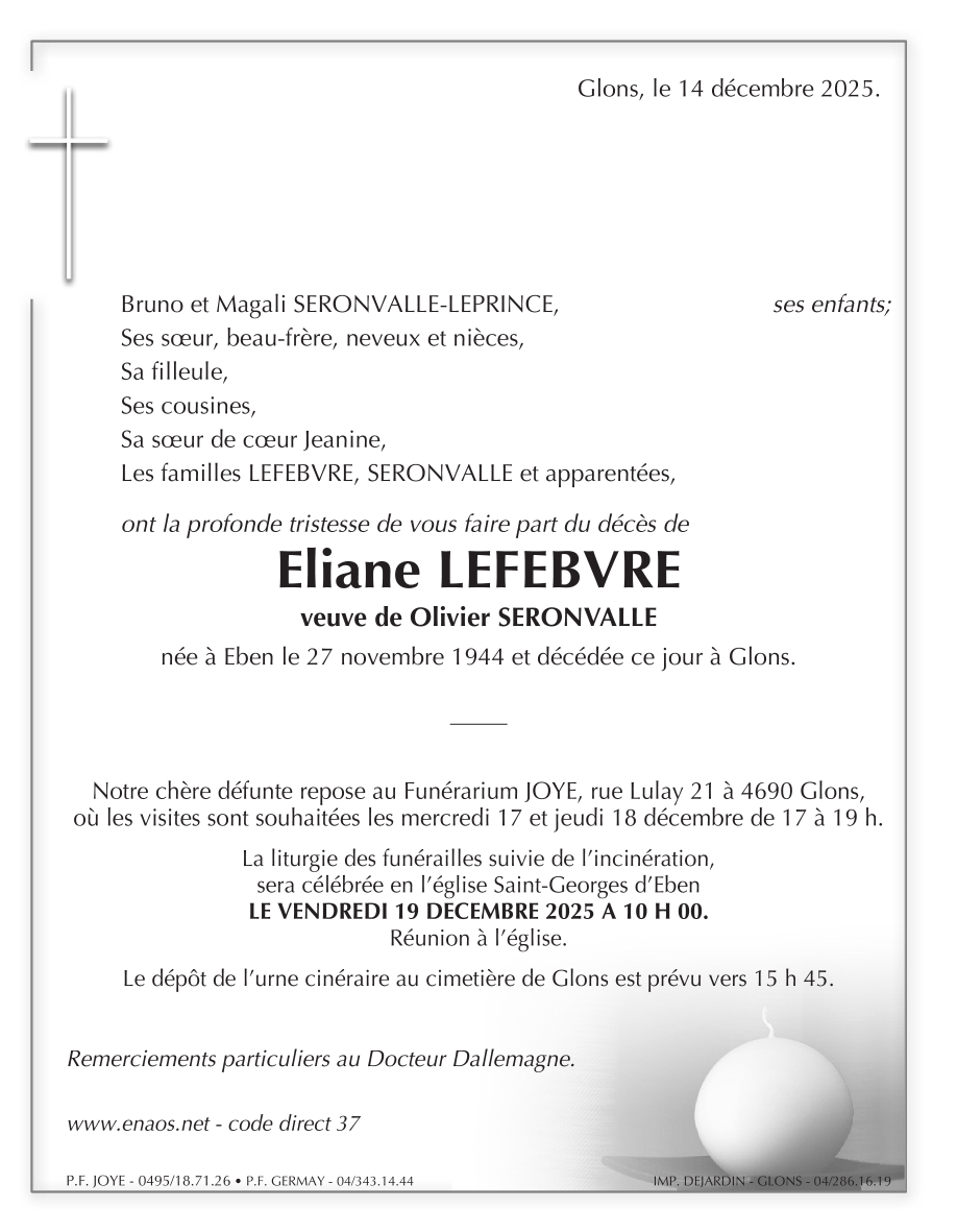 Décédée à Glons (4690, Belgique) le dimanche 14 décembre 2025 à l'âge de 81 ans