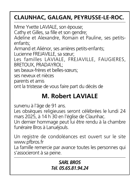 Died in Montbazens (12220, France) on 20 March 2025 at the age of 91 years