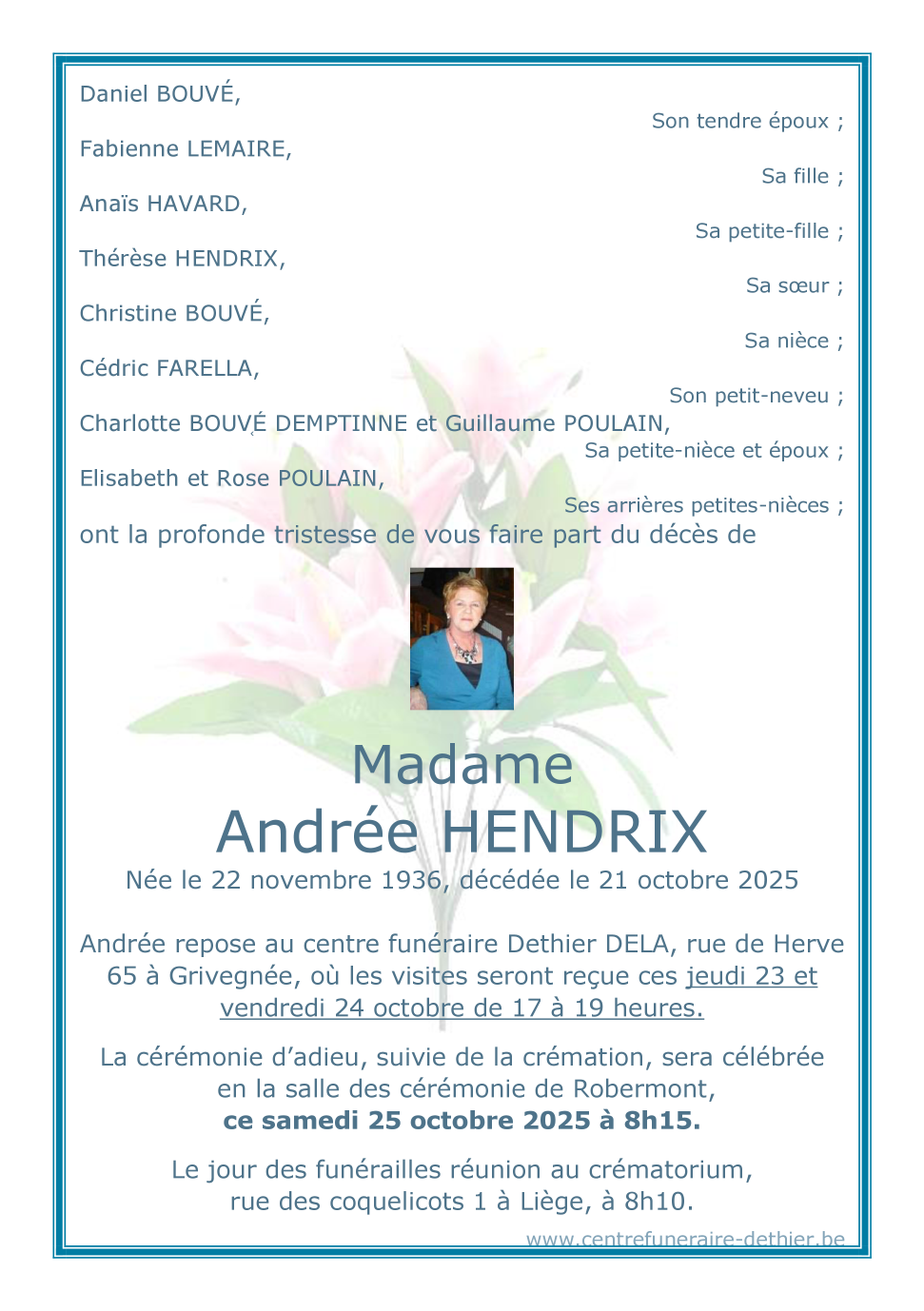 Fallecida en Grivegnée (4030, Bélgica) el martes, 21 de octubre de 2025 a la edad de 88 años