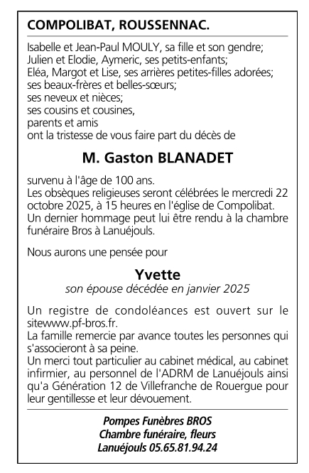 Décédé à Compolibat (12350, France) le lundi 20 octobre 2025 à l'âge de 100 ans