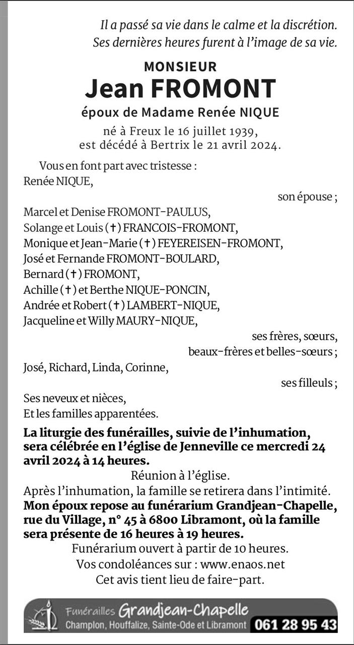 Overleden te Bertrix (6880, België) op zondag 21 april 2024 op 84-jarige leeftijd