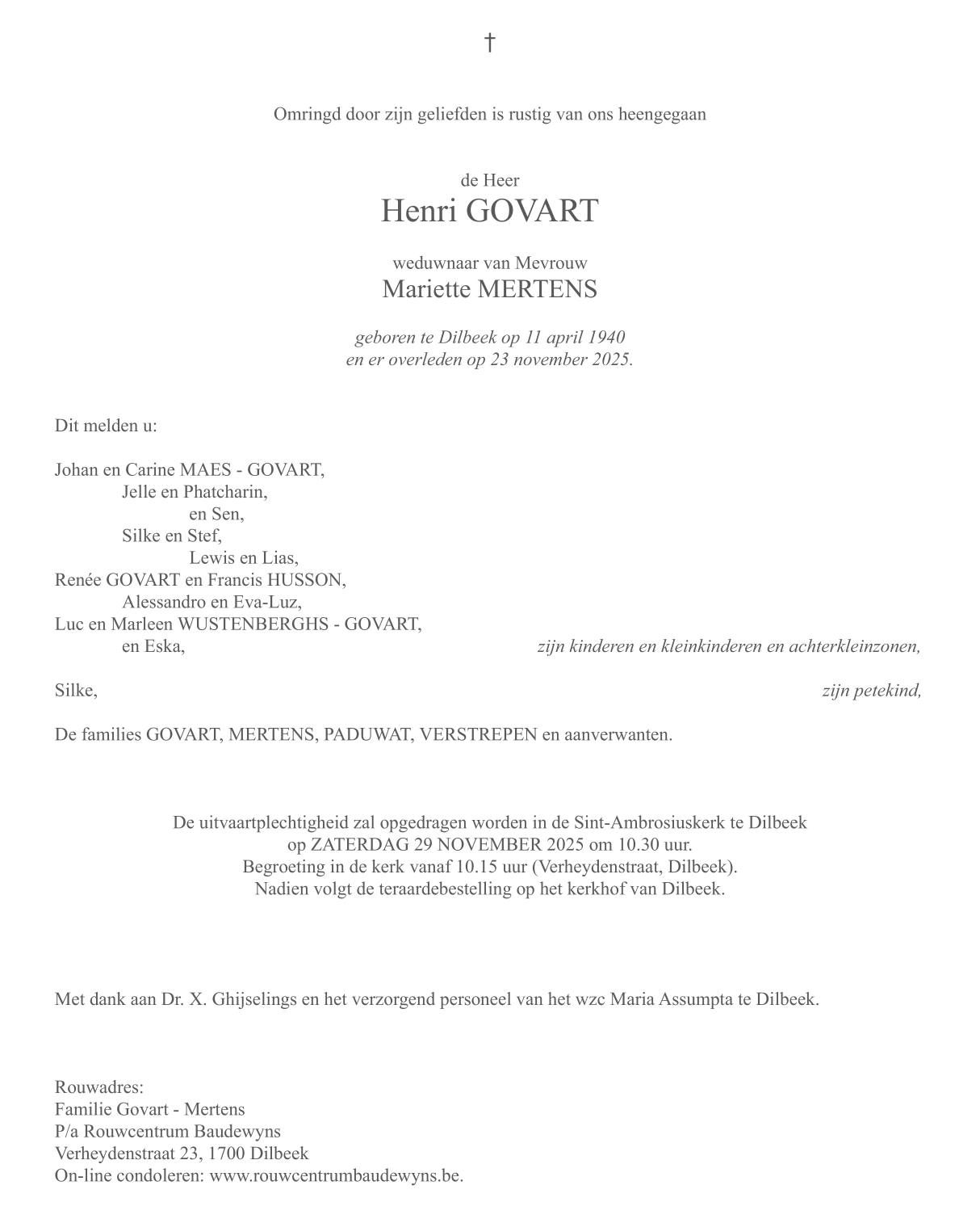 Décédé à Dilbeek (1700, Belgique) le dimanche 23 novembre 2025 à l'âge de 85 ans