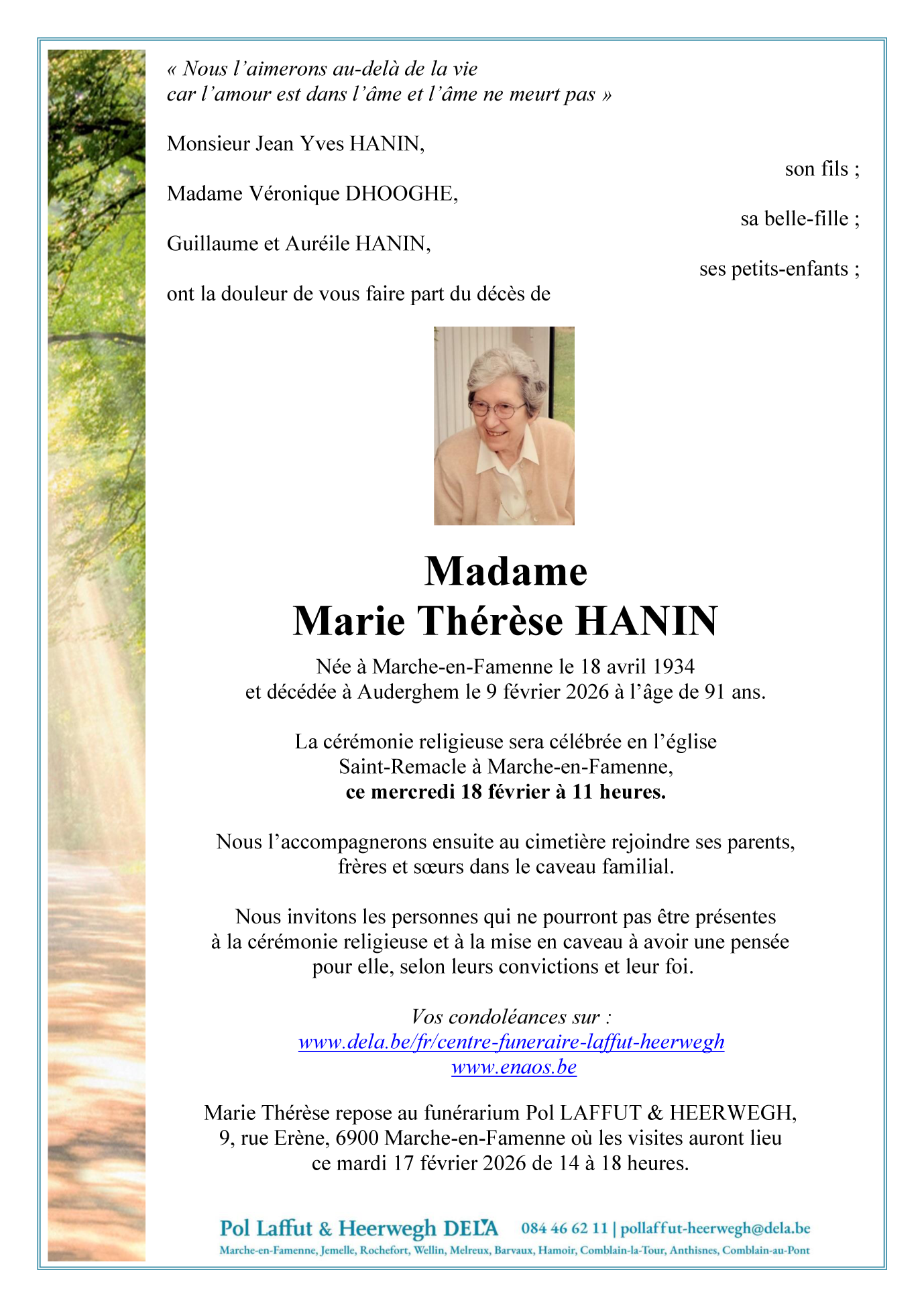 Décédée à Auderghem (1160, Belgique) le lundi 9 février 2026 à l'âge de 91 ans